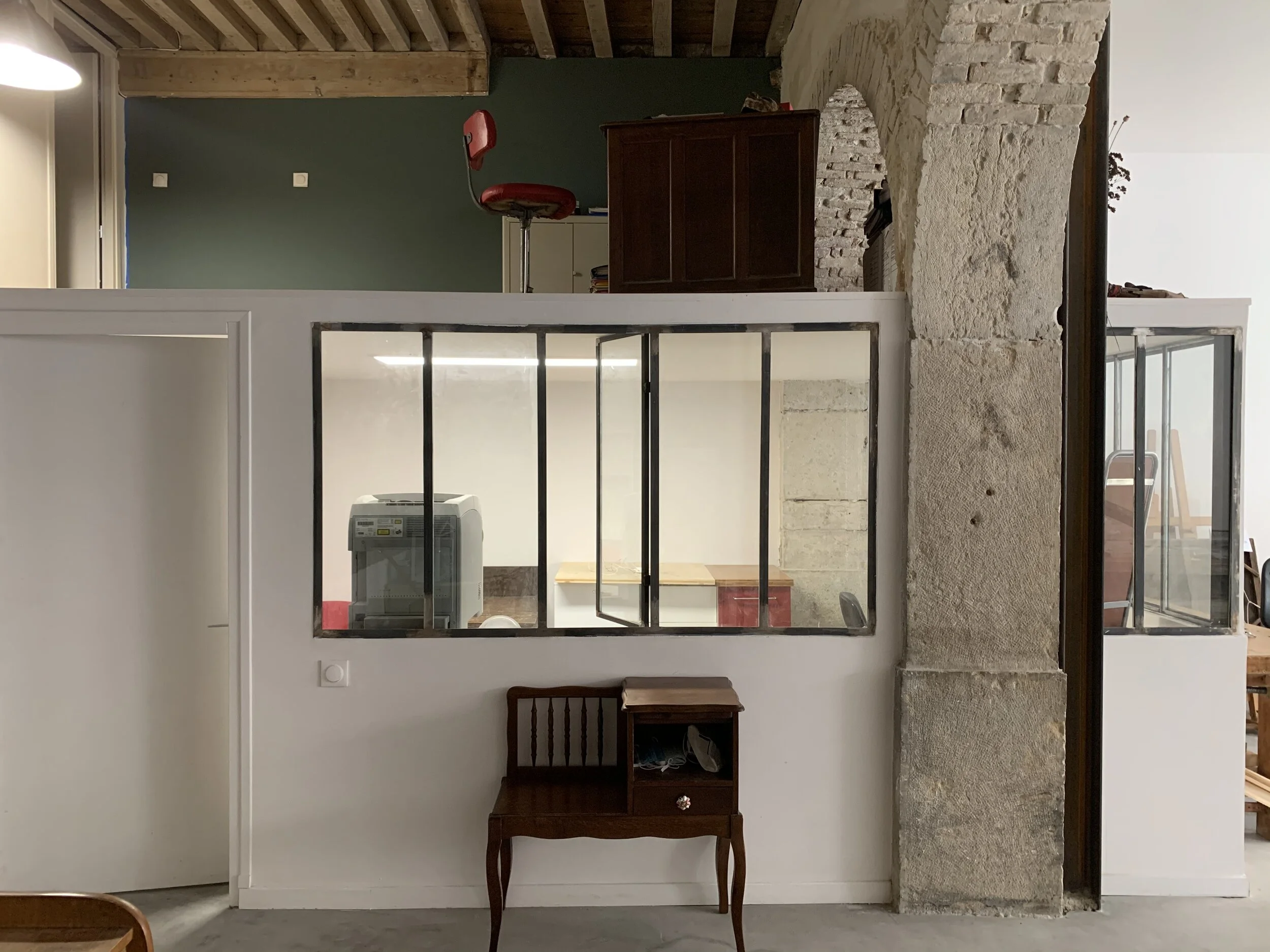 L’atelier dispose d’une surface au sol de 110 m2 avec hauteur sous plafond comprise entre 3,5 et 4 m. Cet espace en fait un lieu privilégié pour le traitement des grands formats. Il dispose également d’un plan de travail modulaire de 14 m2. La surface est divisée entre des parties atelier ouvertes, des espaces bureau et un laboratoire plus spécifiquement dédié aux travaux avec des produits chimiques (paillasses, stockage des solvants, hotte, extraction). Cet espace est complété par une cuisine, une salle de bain ainsi qu’un studio en mezzanine favorisant l’accueil de stagiaires ou de restaurateurs en déplacement.